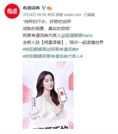 在2021年3月24日,網(wǎng)易有道詞典宣布歐陽娜娜為2021年度全新品牌代言人,并邀請其成為有道詞典“明星語音”功能女聲明星。