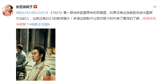 《1921》7月1日正式上線!蕭子升扮演者張哲瀚向革命先輩致敬!正是因?yàn)橛刑嗵嗟娜嗽?921年挺起中國的脊梁,才能有2021年當(dāng)代的繁華!這百年崢嶸歲月,生生不息是星火,一往無前是無畏!明星經(jīng)紀(jì)公司跟演員張哲瀚一起,致敬百年風(fēng)華!致敬偉大的祖國!