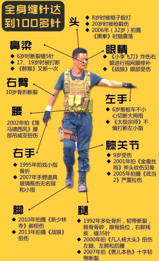 據(jù)說(shuō),吳京拍戲是從來(lái)都不用替身的,無(wú)論是多危險(xiǎn)的戲份他都是親自上陣,對(duì)于演員來(lái)說(shuō),拍攝現(xiàn)場(chǎng)一般都是非常辛苦的,尤其是武打戲,受傷都是常有的情況,據(jù)吳京的粉絲統(tǒng)計(jì),截止至今,吳京全身上下縫了100多針,頭部、眼睛、鼻梁、四肢等都曾多次受傷,吳京也曾在采訪中表示:自己不是靠臉吃飯的,而是靠命,所以受傷很正常,如果拍攝動(dòng)作戲不受傷的話,那還能叫作動(dòng)作戲嗎?網(wǎng)上也流傳著多張吳京受傷的圖片,各個(gè)時(shí)間段的都有,連自己婚禮的時(shí)候都是杵著拐杖。上海明星經(jīng)紀(jì)公司不得不說(shuō)這樣的演員真的很讓人敬佩,沒(méi)有人可以隨隨便便成功,在羨慕別人的同時(shí)應(yīng)該問(wèn)問(wèn)自己能不能吃的了這樣的苦。