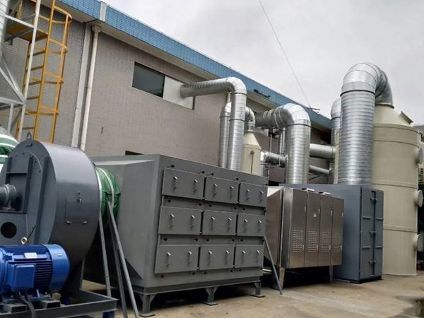 靜電粉末噴涂固化過程產(chǎn)生的高溫有機(jī)廢氣,由集氣罩或排風(fēng)管道收集,送入噴淋塔降溫和去除粉塵后,有機(jī)廢氣進(jìn)入U(xiǎn)V光解凈化器,利用UV光解凈化器中高能高臭氧UV紫外線燈光束照射裂解有機(jī)分子鏈結(jié)構(gòu),同時(shí)通過高臭氧UV紫外線光束分解空氣中氧分子產(chǎn)生游離氧的極強(qiáng)氧化作用快速氧化裂解的有機(jī)分子使其轉(zhuǎn)化為水和二氧化碳。未完全分解氧化的少量有機(jī)成分進(jìn)入活性炭吸附凈化器后通過活性炭的吸附凈化分離出有機(jī)物,凈化后的空氣達(dá)標(biāo)高空排放。