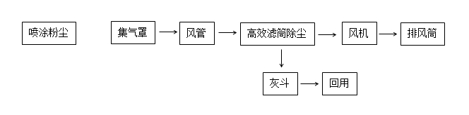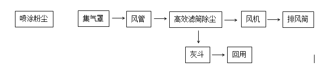 噴粉工藝在密閉的工作間內(nèi)進(jìn)行,用引風(fēng)機(jī)將含粉塵氣體收集進(jìn)入集氣罩,經(jīng)高效濾筒除塵器過濾粉塵,粉塵進(jìn)入灰斗,可收集后重復(fù)利用。