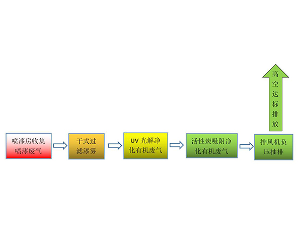 噴涂廢氣經(jīng)過干式漆霧過濾后,有機(jī)廢氣進(jìn)入UV光解凈化器,利用UV光解凈化器中高能高臭氧UV紫外線燈光束照射裂解有機(jī)分子鏈結(jié)構(gòu),同時通過高臭氧UV紫外線光束分解空氣中氧分子產(chǎn)生游離氧的極強(qiáng)氧化作用快速氧化裂解的有機(jī)分子使其轉(zhuǎn)化為水和二氧化碳。未完全分解氧化的少量 有機(jī)成分進(jìn)入活性炭吸附凈化器后通過活性炭的吸附凈化分離出有機(jī)物,凈化后的空氣達(dá)標(biāo)高空排放。