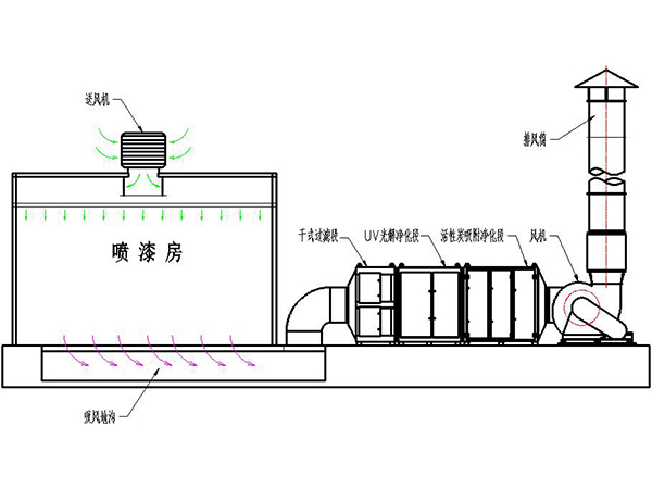 UV光解+活性炭吸附廢氣治理方案主要適用于小批量、間歇式作業(yè)、噴漆量不大,處理風(fēng)量不大的噴漆廢氣治理。此方案為組合治理技術(shù),屬于國家環(huán)保政策提倡的組合治理技術(shù)范疇。