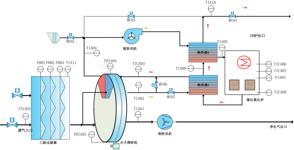 經(jīng)過(guò)冷卻區(qū)的空氣,經(jīng)過(guò)加熱后做為再生空氣使用,達(dá)到節(jié)能的效果。脫附出來(lái)的高濃縮廢氣送入催化燃燒爐,借助催化劑可使有機(jī)廢氣在較低的起燃溫度條件下發(fā)生無(wú)焰燃燒,并氧化分解為CO2和H2O,同時(shí)放出大量熱,釋放的熱量用來(lái)加熱脫附氣流和業(yè)主換熱另做其他用途。