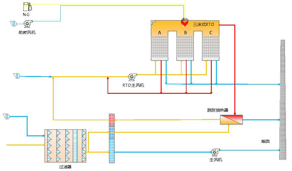 經(jīng)過冷卻區(qū)的空氣,經(jīng)過加熱后做為再生空氣使用,達(dá)到節(jié)能的效果。脫附出來的高濃縮廢氣送入蓄熱氧化爐,蓄熱式氧化技術(shù)把有機(jī)廢氣加熱到760℃以上,VOCs在燃燒室中氧化分解為CO2和H2O,凈化效率高。熱氧化產(chǎn)生的熱量通過蓄熱式換熱陶瓷,將富余熱量貯存在陶瓷中用于預(yù)熱低溫廢氣,大大降低系統(tǒng)輔助燃料消耗量,蓄熱效率高。當(dāng)?shù)竭_(dá)一定的濃度時,產(chǎn)生的熱量不僅能滿足RTO自身運(yùn)行需求,同時可為其他設(shè)備提供熱量,如脫附換熱器、熱水換熱器等。在滿足環(huán)保目標(biāo)的同時,實現(xiàn)經(jīng)濟(jì)效益。